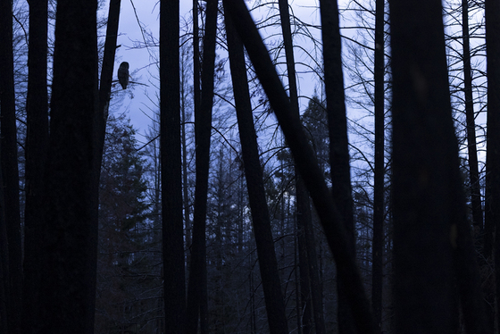 At dusk, a great grey owl perches in the vicinity of its nest as it listens for small rodents in the undergrowth.