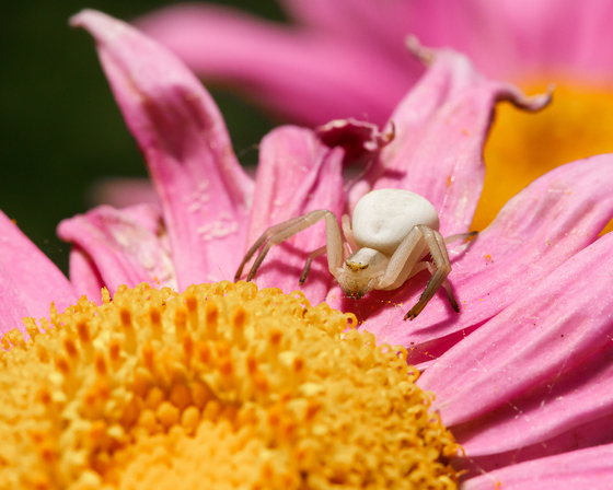 I have a few white crab spiders, also known as goldenrod or flower crab spider, in my garden, but they tend to be a bit shy. This spider was tending a small web, and waiting for a meal to come along. He/she didn't seem to be disturbed by my many movements around his location as I photographed other insects and spiders using my 100mm Macro lens, so I was able to get quite close to this beauty. I also cropped my photo so I was further away than this appears.