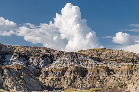 Horseshoe Canyon is an area of badlands near Drumheller, Alberta. It's an arid area, but that doesn't stop massive storm clouds from building around it on hot summer days.