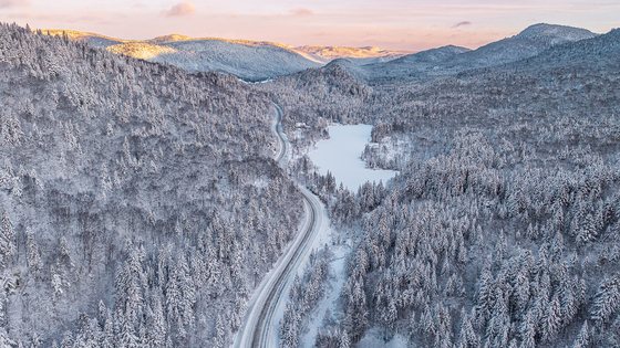 Tagged: landscape winter nature road plant tree slope ice vegetation outdoors land woodland fir scenery mountain conifer mountainous_landforms snow highland hill mountain_range wilderness freezing valley
