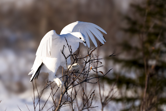 A willow ptarmigan makes a precarious landing atop a willow shrub