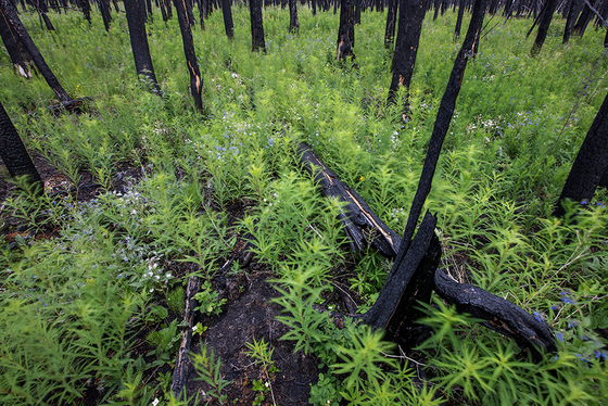 New growth blows in the wind in an area affected by wildfires in northern BC.