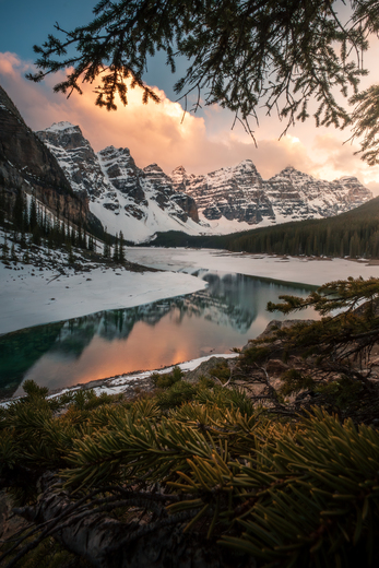 Tagged: lake winter morraine alberta sunset plant tree nature outdoors wilderness fir mountain mountain_range scenery landscape ice sky water glacier peak conifer mountainous_landforms natural_landscape highland hill valley