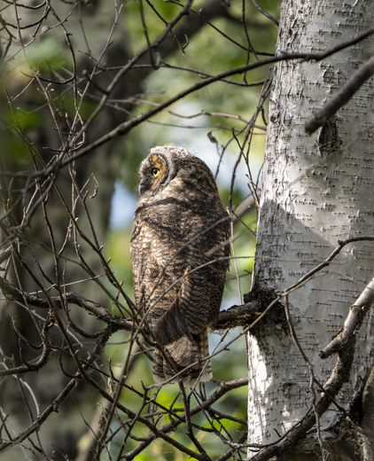 Long-eared owls commonly roost in areas of the forest which are thick with branches both low to the ground and higher in trees which is where I spotted this one. Lucky for me it had found a spot with an opening, an open window if you will, as there was an area where the branches allowed for a clear view of the owls upper body.