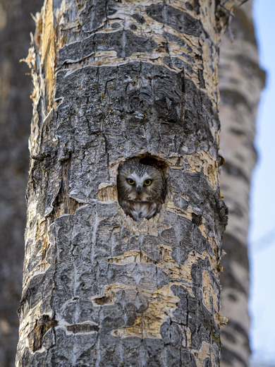 This Saw-whet owl had started guarding this tree hole nest before its mate arrived back in the spring of 2025. I would do a weekly check after first spotting it roosting on a spruce tree that not too far off to the side of this tree hole.