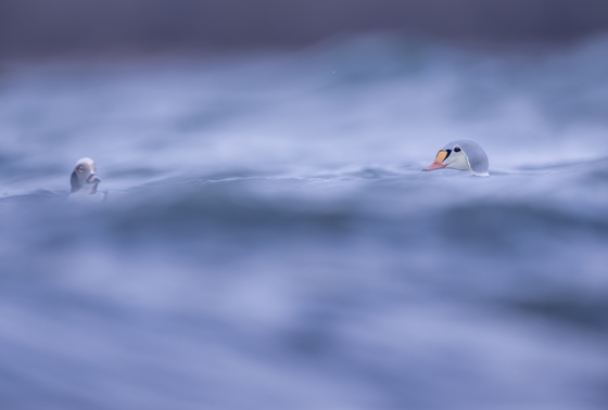 A male King Eider and a Long-tailed Duck photographed amidst heavy sea spray. This shot captures the harsh, beautiful reality of pelagic waterfowl, using a shallow depth of field to isolate the subjects against the blurred texture of a rising wave.