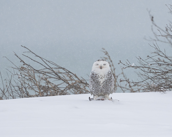 animal bird beak outdoors nature owl winter snowy_owl vertebrate bird_of_prey twig snow wing morning