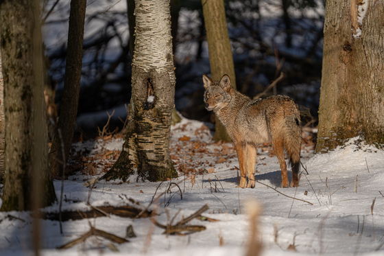 animal coyote mammal canine dog pet red_wolf wolf fox wildlife canis carnivores winter snow trunk terrestrial_animal gray_fox