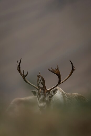 This grand bull Woodland Caribou peeks above the low lying shrubs against a background of 500 million year old rock from the earths mantle known as the Tablelands in Gros Morne National Park.