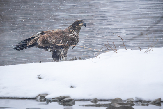 bird eagle bald_eagle raptor bird_of_prey nature wildlife winter snow pond ontario canada animal outdoors accipitridae beak accipitriformes falcon freezing