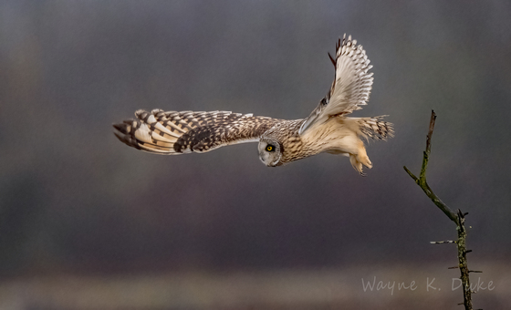 Short Eared Owl leaving it's branch to go hunt the fields.