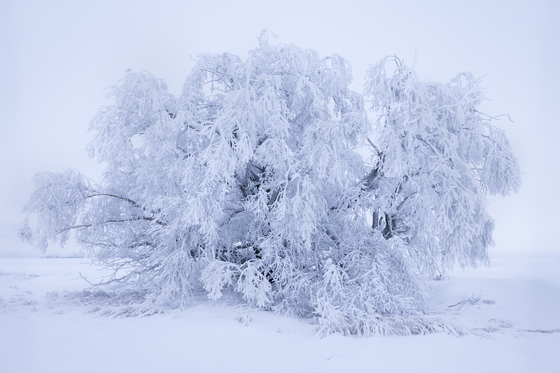 Rime ice coats a solitary tree during a foggy winter morning in Alberta. Formed when supercooled fog freezes on contact, rime ice reshapes familiar landscapes into fleeting winter sculptures—quiet, fragile, and shaped entirely by weather.