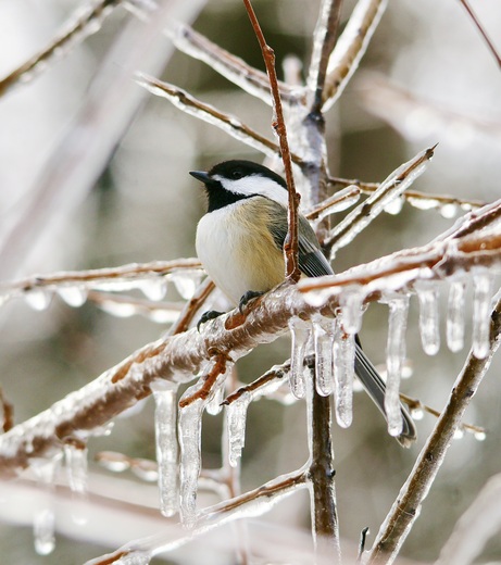 freezing rain ice nature outdoors winter snow animal bird icicle branch twig black-capped_chickadee tit carolina_chickadee feather