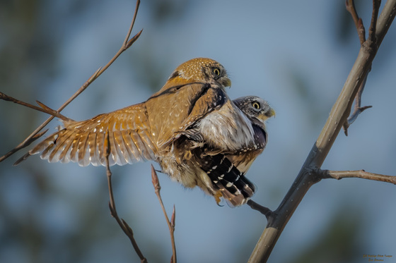Several days ago I was lucky enough to come across, what I though was one pygmy owl. All of a sudden a male comes in and perches next to the female. It was interesting to watch the male look at the female, as if to ask permission. The mate session took no more than 10 seconds. Pairs often form around March and normally for only one breeding season. There are several old woodpecker holes in the area in which they will probably build their nest.