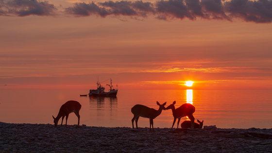 Deer and lobster boat at sunrise, Anticosti Island