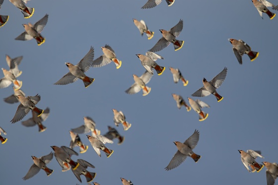 All it takes with these Waxwings, is for one to take off and they all will normally follow. It's hard to get a photo of them as they take flight, especially when it happens from right above you.