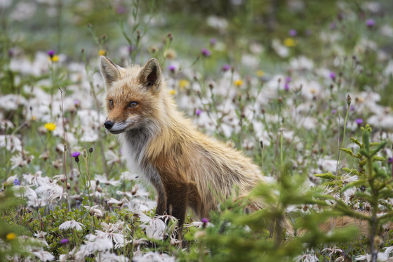 Young red fox and wild flowers