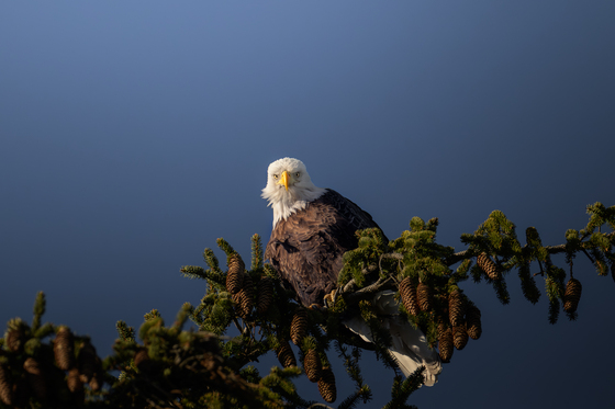 An unexpected encounter with a wild Bald Eagle perched high in a spruce tree in Ontario. For a brief moment, the eagle locked its intense stare directly toward the camera before continuing to scan the landscape from its lookout