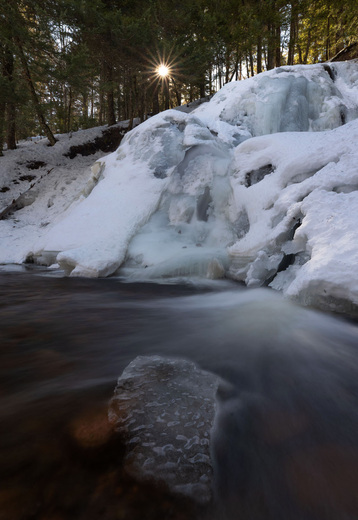 Wentworth Falls just before the final melt. Nestled in the trees with a crown of sun above the frozen waterfall