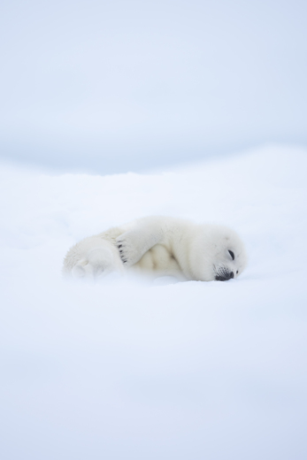 A harp seal pup, likely just one to two weeks old, rested on the ice. Not far away lay the partially snow-covered remains of an adult seal. Over the course of three days, the pup remained in roughly the same spot, and no mother returned to nurse it. I couldn’t help but wonder if the nearby carcass was that of its mother and now facing a tragic and certain fate? Or was this simply the abrupt reality of natural weaning and its mother had left, the pup now on the brink of its solitary journey to the sea left to learn to hunt and feed itself? Either way, the beauty of the environment and the moment served as a powerful reminder of the inevitable challenges and risks of being “Born of the Ice.”