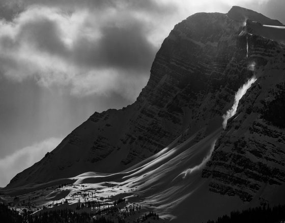 I was visiting Bow Lake in Banff National Park on a beautiful sunny day. I had rented a 200mm-600mm lens and I wanted to see what other genres of photography I could take aside from wildlife with this lens. I realized that I was able to get closer to the intimate scenes of the mountain side, which thrilled me. I knew this picture was going to be in black and white. I loved the way the light was hitting this scene and I was focused on that. What I didn't realize until I got home that there was an avalanche going off on the left hand side. What a nice surprise