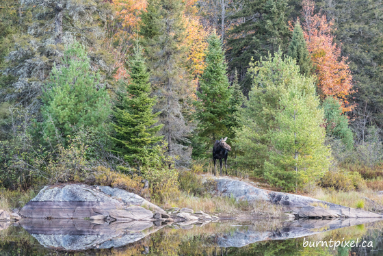 I was just starting a sunrise hike in Algonquin Park when I spotted a moose and her little one foraging along the shore of a pond. I missed most of the sunrise at the viewpoint, but I was happy I stopped here for this amazing scene. I had left my long telephoto in the car due to trying to lighten my pack for the hike, but this shorter lens helped me to show the environment and the fall foliage. This was when the mom came through the trees by herself to take a look around. I liked the reflection of the rocks in this one.