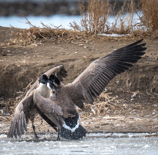 I was visiting Frank Lake yesterday and there were many birds there including a ton of Canada Geese. This fight broke out in the distance and I had never seen a real goose fight before. They were grabbing each others necks and then swatting each other with their wings. It felt like it went on forever. I ended up taking some video as well. I am slowly going through the 100 pictures I took of this fight, but I thought I would start with this one. I needed to bring up the light in this photo as the black heads are hard to seperate out.