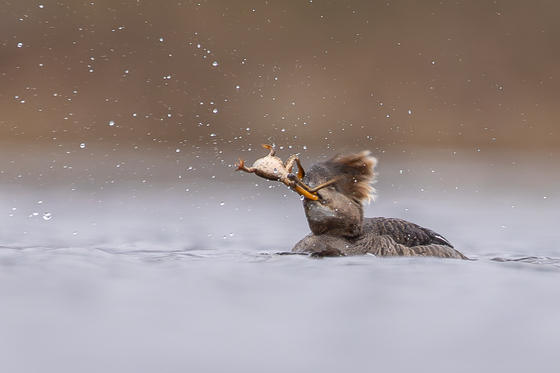 Hooded merganser with 🐸
