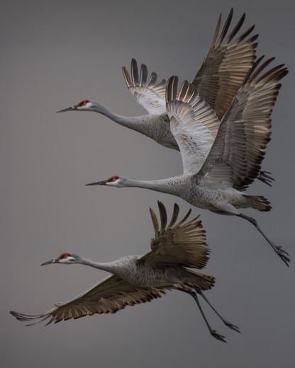 Three Sandhill Cranes glide in tight formation, their wings arched in perfect rhythm. This intimate composition showcases the beauty of coordinated flight and the strong social bonds of these iconic migratory birds.