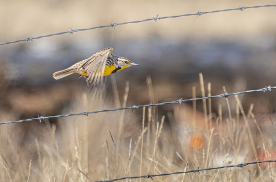 I was hoping to come across some Bluebirds over the weekend, but I didn't get to see them at all. The temperature had dropped quite a bit and we had gotten snow over the weekend, so I think they went somewhere a little warmer for the time being. The Meadowlarks on the other hand, have all stuck around, I am seeing some larger groups in the mornings, which is amazing to see. This time I had pulled over, I saw about 20 flying around and land in a hillside by the road, so I pulled over and rolled my window down and just sat in my vehicle watching them collecting insects from the ground. I saw one fly to a fence post and decided to focus on it, when it took off towards the ground, I wasn't sure if I got the shot, but quickly looking at my cameras screen, I saw that I did get the shot. I loved that it was placed in between the barbed wire fence.