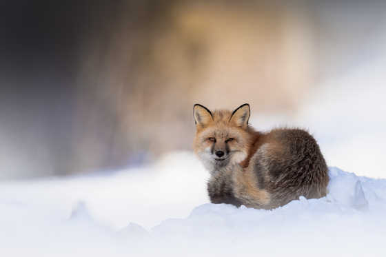 A red fox bundled up in a snow drift