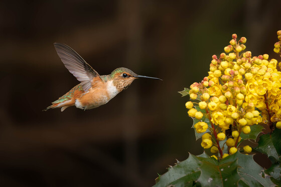 This energetic Anna's Hummingbird was buzzing around these Oregon Grape Flowers in full bloom.