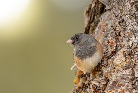 I was getting home from work and while walking to our home, I noticed quite a few Juncos in the tree. I decided to stop and take some photos of this one that was sitting perfectly on the edge of the tree. I really loved the roughness of the bark and the soft lighting of the background from surrounding trees.