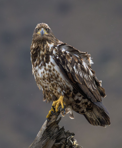 I saw this immature bald eagle hunkered down in the rain on a tiny tree top. I couldn't resist stopping to snap a few frames and its look said it all! :)