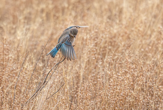 As I was watching all the Bluebirds flying around, chasing one another around, I saw this female in this field. I almost missed my chance on getting her photo, in fact I thought I had missed it. I only got one photo, and it was even better than I could have imagined. I loved the colour of the dried up weeds against her colouring. What's even better, was the way she was posing, as she was leaving her perch to land on the ground below her.