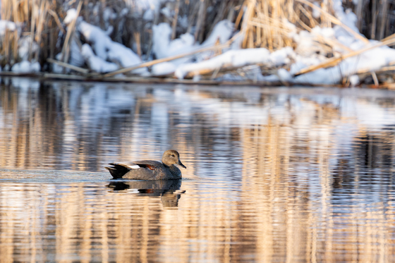 A male Gadwall duck looking good in the late day light, there was still some snow in the reeds from an early spring snowfall earlier in the day.