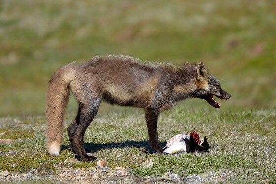 A Newfoundland Red Fox with a seabird kill along the cliffs of Cape St. Mary's Ecological Reserve.